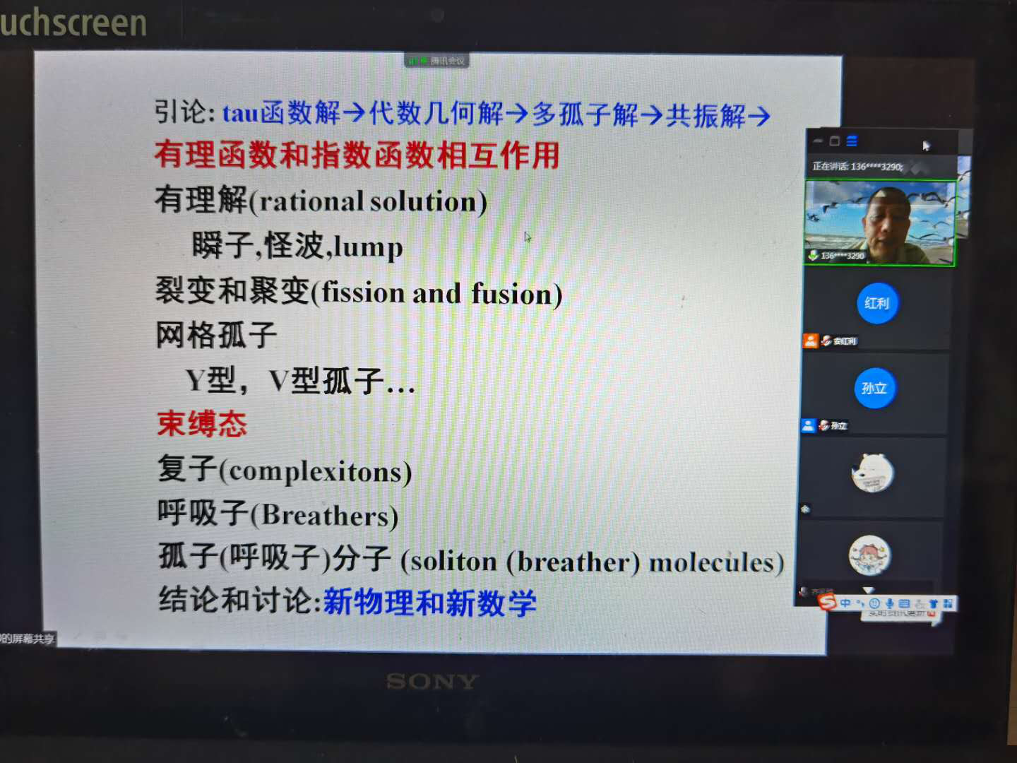 楼森岳教授首先介绍了可积系统理论中存在的Tau函数解→代数几何解→多孤子解→共振解,接着提出了孤子分子的概念。孤子分子最早是在物理实验中所观察到的一种特殊现象。由于孤子能抵御扰动,孤子之间可以存在吸引力和排斥力,类似于化学分子。利用这些相互作用产生了孤子脉冲之间的束缚态,即为孤子分子。最后,楼森岳教授讲授了产生孤子分子的理论机制,并详细介绍其课题组在这方面的出色工作。楼森岳教授的报告内容精彩纷呈,报告语言通俗易懂。报告结束时,楼森岳教授与在线师生就生物振荡模型中是否存在孤子、孤子分子,大气海洋中的对流现象是否可能会产生孤子分子等问题,展开了热烈的交流与讨论。本次学术会议拓展了广大师生的学术视野,丰富大家的见识,取得了良好的专业学习效果。