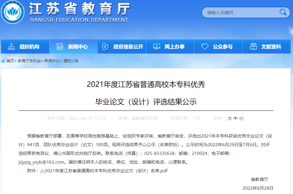 近日,江苏省教育厅公布了2021年度江苏省普通高校本科优秀毕业论文(设计)评选结果,福利姬