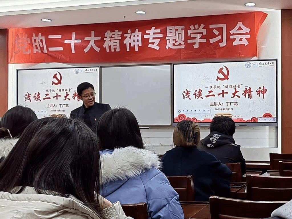 报告会后,丁广龙作了题为“浅谈党的二十大精神”专题辅导报告。他从 “为什么学”“怎样学”和“如何践行”等三个方面,带领同学们学习了党的二十大精神主要内容。他说,学习宣传贯彻党的二十大精神是加强党的政治建设的根本要求,学懂弄通做实党的二十大精神是青年学生实现自身全面成长的必然要求,青年学生要通过原原本本研读二十大报告原文,学深悟透应知应会知识点以及组织开展大讨论等方式,全面系统深入掌握党的二十大报告核心要义,深刻领会“两个确立”的决定性意义,切实增强“四个意识”,坚定“四个自信”,坚决做到“两个维护”。他希望,广大学生党员要做坚决贯彻执行党中央路线方针政策的忠诚拥护者,自觉弘扬社会主义核心价值观的坚定践行者,立志推动基础研究原创性突破的勇毅开拓者,在大战大考中发挥领头雁作用的无私奉献者。