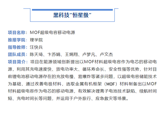 近日,第十八届“挑战杯”江苏省大学生课外学术科技作品竞赛黑科技专项赛事在常州大学落下帷幕。经过激烈的比拼,福利姬 化学系由汪快兵老师指导,陈天琦、卢文杰等5位学生共同完成的《MOF超级电容移动电源》项目被评定为黑科技专项赛“一等奖”(恒星级)。