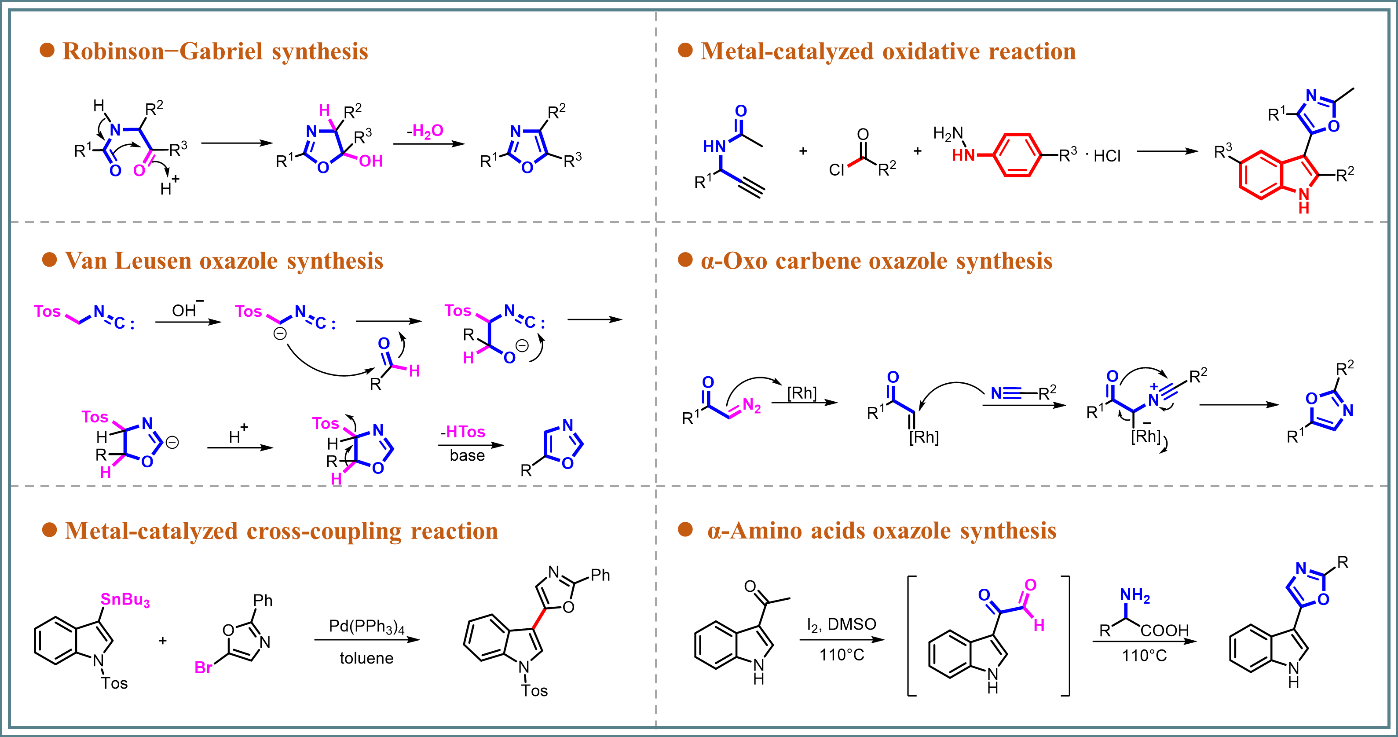 5-(3’-吲哚基)噁唑化合物表现出的广泛生物和药理活性,引起了许多研究者的兴趣,开发或应用许多化学合成方法获得此类化合物,例如Robinson-Gabriel合成、Van Leusen合成、金属催化交叉偶联/氧化反应、α-氧卡宾方法及α-氨基酸关环法等,文章系统梳理了自第一个5-(3’-吲哚基)噁唑化合物Pimprinine发现并合成以来所报道的大量合成5-(3’-吲哚基)噁唑骨架的方法。值得一提的是,团队通过合成路线优化,以便宜易得的吲哚为原料,开发出三步高效合成Pimprinine和四步高效合成Streptochlorin的方法。