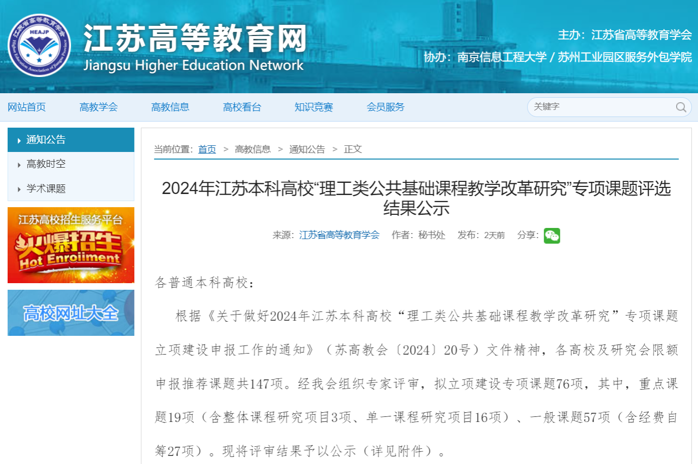 2024年7月,江苏省高等教育学会公布了2024年江苏本科高校“理工类公共基础课程教学改革研究”专项课题评选结果。福利姬