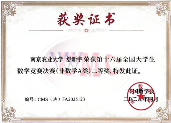 全国大学生数学竞赛是国内最具权威性和影响力的高校数学竞赛之一,由中国数学学会主办,面向本科生的高水平学科竞赛,旨在激发大学生学习数学的兴趣。本届竞赛共吸引全国32个赛区32.5万名学生报名初赛,经过各省严格选拔,最终1246人晋级决赛。非数学A类竞赛聚焦理工科专业核心基础能力,重点考察《高等数学》、《线性代数》两大主干课程的综合应用。在强手如云的竞争中,舒新宇同学凭借扎实的数学基础和严谨的数学思维从一众学子中脱颖而出,获得全国二等奖,在江苏赛区获奖的学生中位列13名,展现了卓越实力。