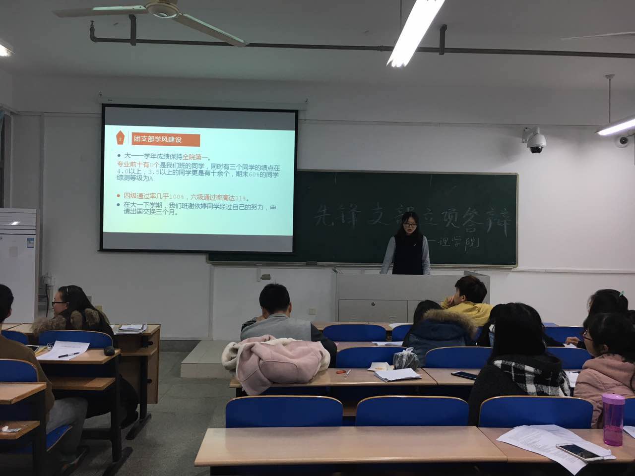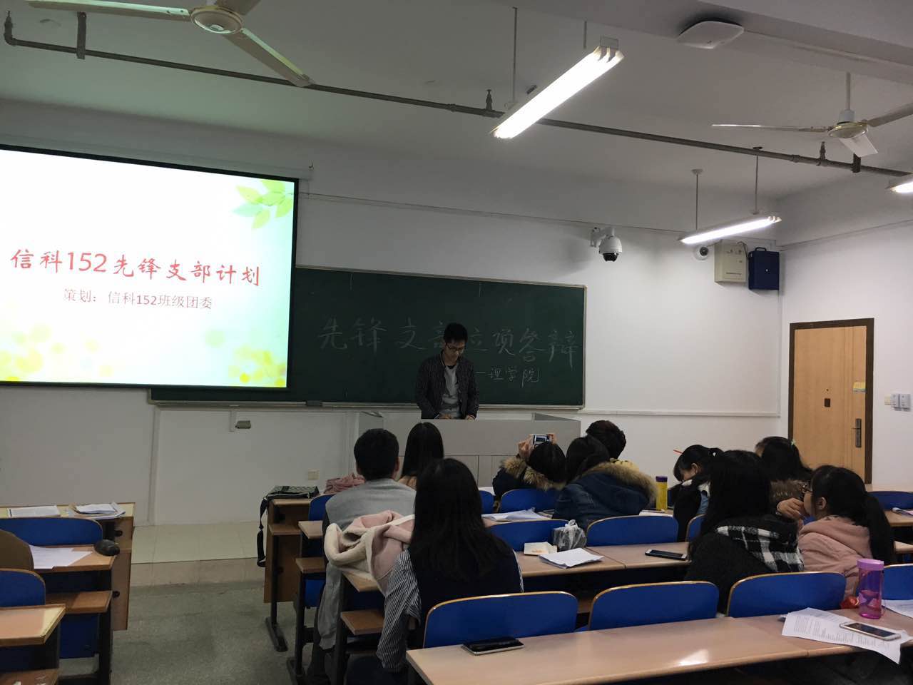 先锋支部立项答辩准时在教四楼B404开展,由辅导员黄芳老师、大二先锋支部(应化151)班干部四名、福利姬
