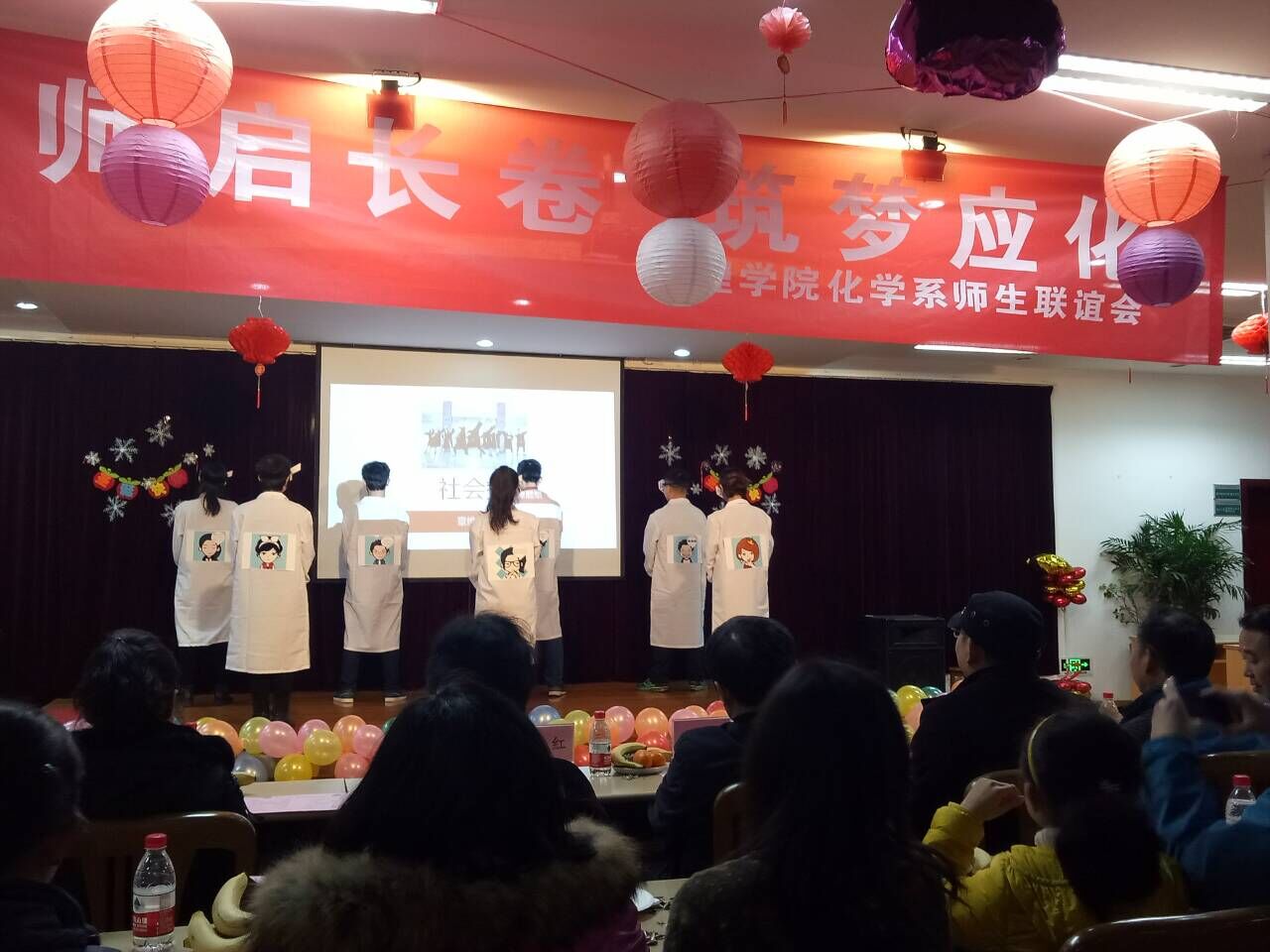 《Lemon tree》 、《千山万水总是情》、《渡情》与《小幸运》,四首悦耳的歌曲让大家如痴如醉。在接下来的你做我猜环节中,由老师和同学配合做游戏,增进了老师与同学们之间的默契感情。在将近两个小时的时间里,大家分别欣赏了来自应化大家庭不同班级各具特色的节目。其中,由曹昕睿YDLH团队带来的《rap star》嗨翻全场。除了好听的歌曲外,还有精彩的小品《教你拍马屁》以及惹人发笑的应化152集体舞《咋了爸爸》。在最后的游戏抽红包有奖环节中,场中持续升温,许多人都在游戏中大显身手,赢得了心仪的奖品,主持人陈荣顺老师更是获得了200元大奖。