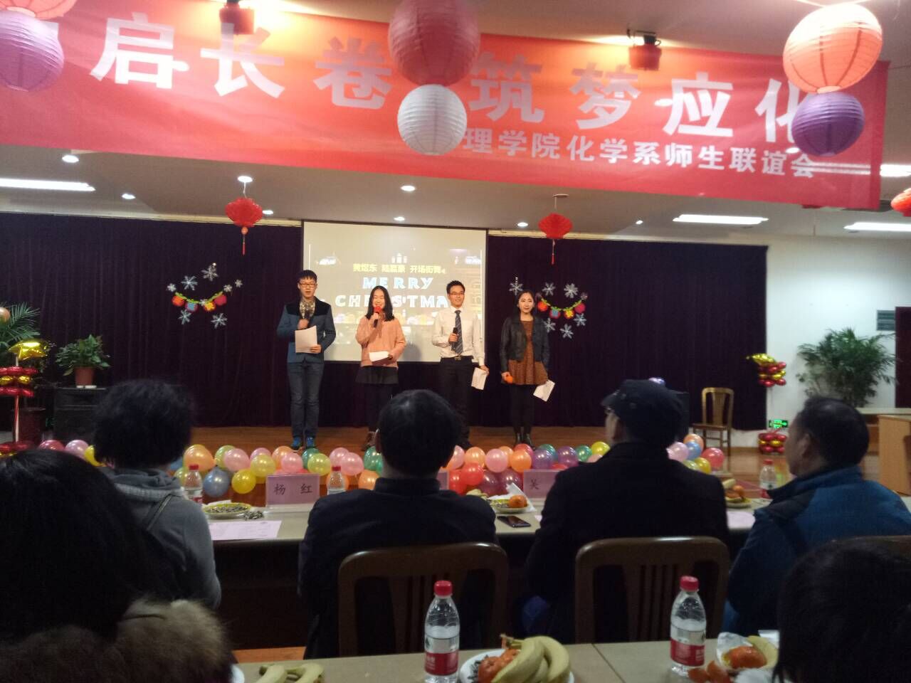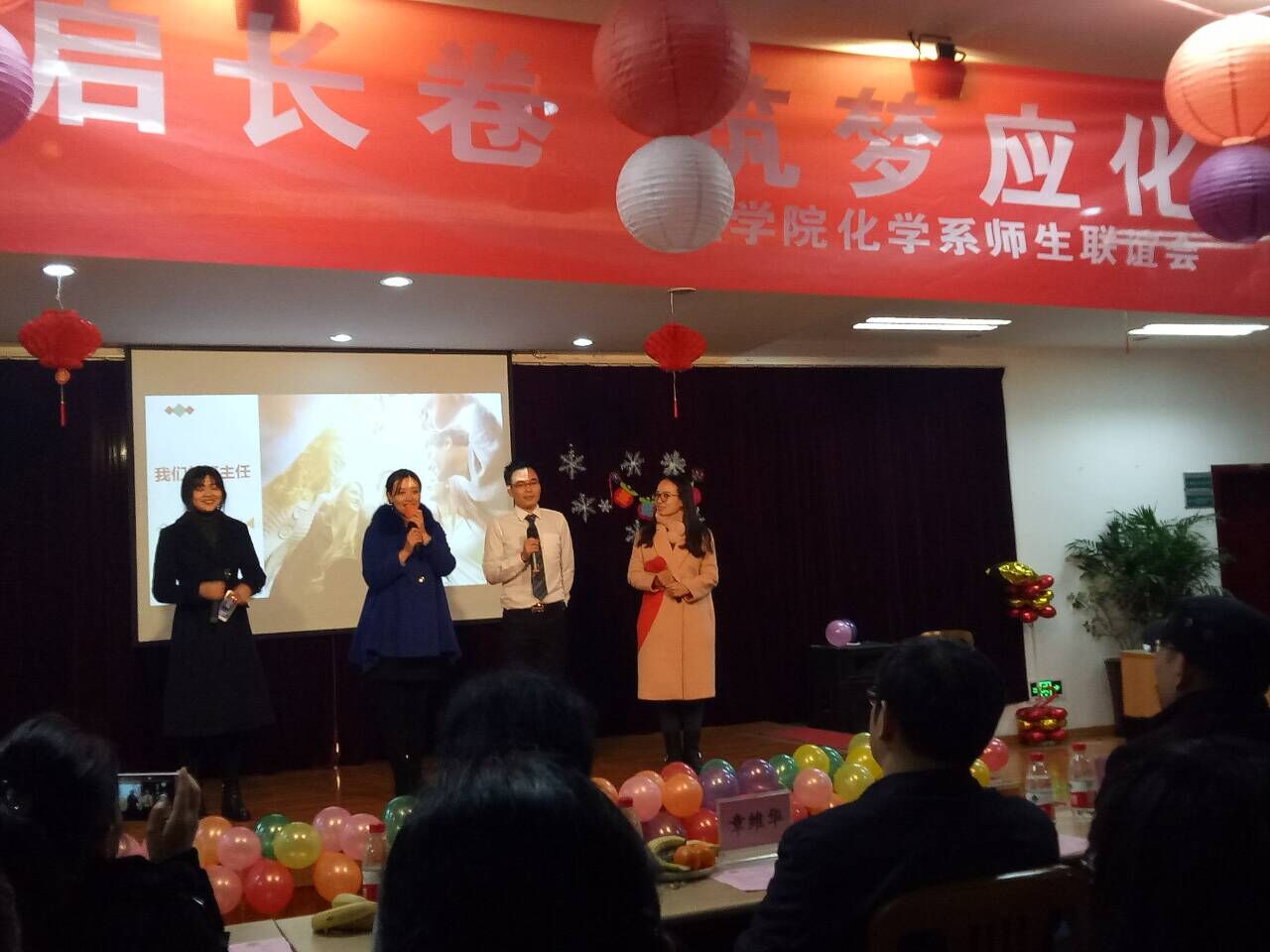 主持人由应用化学系陈荣顺老师、研究生周华婷、大二学生王泽铭和宋柯静担任。第一个节目是由应化班主任代表刘照云老师、陈荣顺老师以及辅导员黄芳、周玲玉老师带来的《朋友》,活跃了现场气氛。