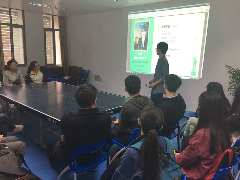 领略过英国留学的独特之后,来自金融学院的徐立言同学向我们介绍了一些关于美国高校的申请流程,他已获得德克萨斯州达拉斯分校和纽约州立大学等多所学校的offer。徐立言主要分享了在美择校的经验,重点比较了不同学校金融学专业的特点,提醒大家要根据自己的偏好选择适合自己的学校。徐同学同时分享了他去美国游学的经历,鼓励大家有机会多走出国门感受异域文化。以他的申请经验来看,语言成绩和在校成绩是美方高校最为看重的两个条件。由于金融学是近年来最为热门的专业之一,在场同学纷纷就跨专业申请、金融行业就业等具体问题向徐同学提问,徐同学也耐心地解答了大家的各种疑问。虽然徐同学说给我们泼一泼冷水,但其真挚而朴实的话语打动了我们在场每个人的心,也使得我们对国外的憧憬变得更加清晰与真实。