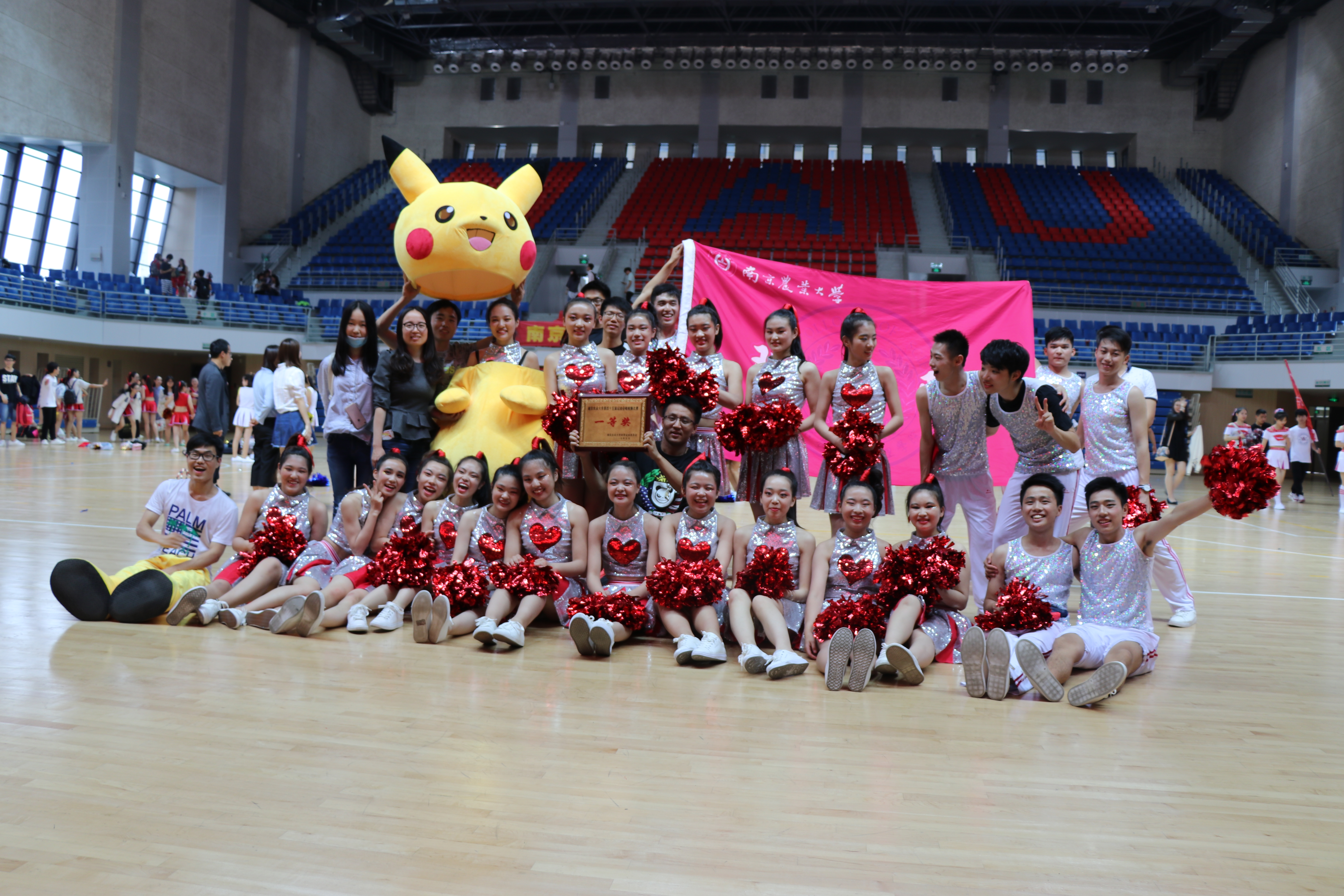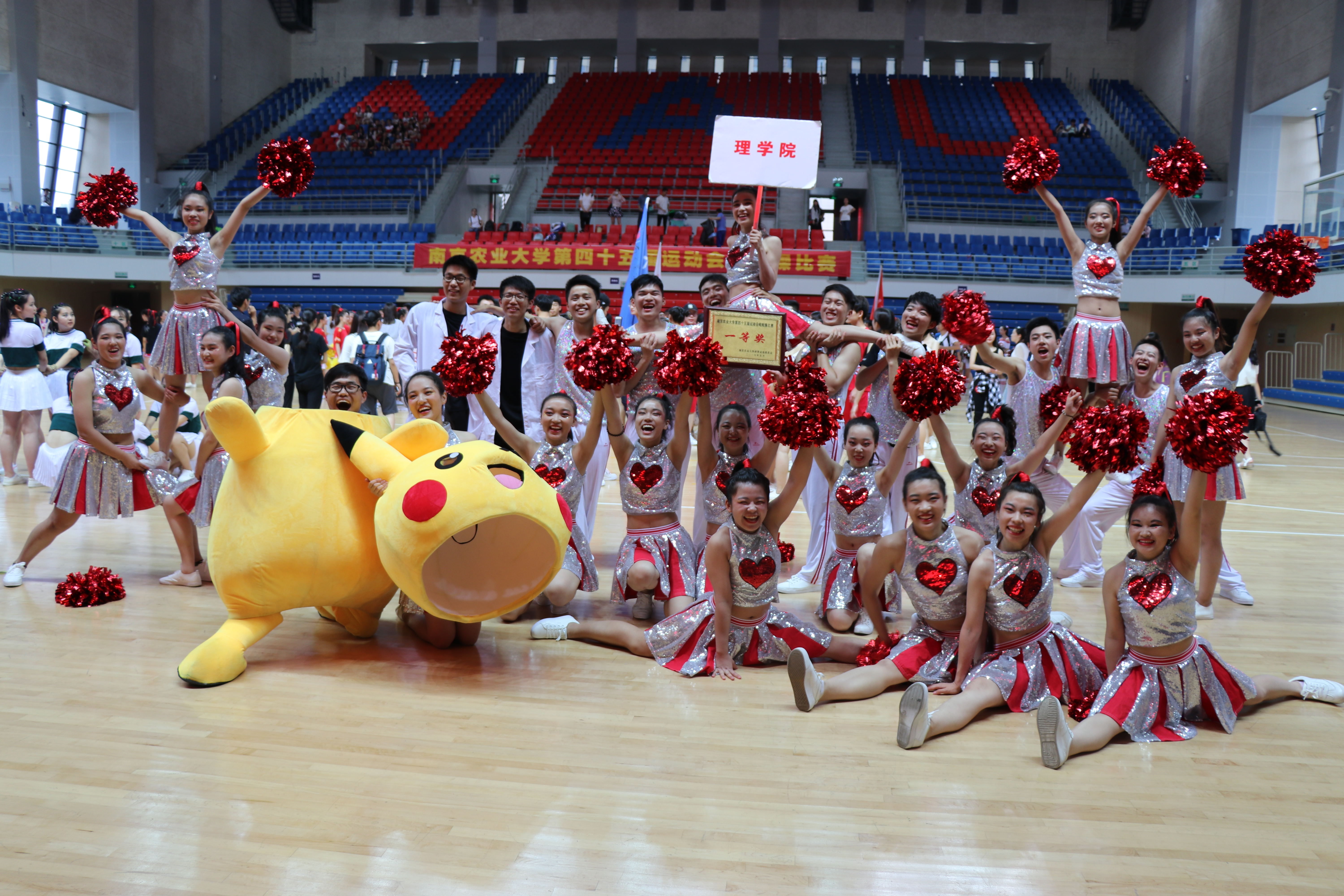 理学队员们步伐整齐、动作有力、精神饱满,让整个赛场充满了青春的活力和时代的气息,充分体现了当代大学生朝气蓬勃、奋发进取的良好精神风貌,展现了理院学子拼搏进取、团结一致的向上精神,迸发出活力与激情。活力四射的舞姿,动感的青春舞步紧紧吸引了现场观众的眼球,唤醒了现场观众们昏昏欲睡的心,高难度的动作引起了观众们的惊呼,萌萌的吉祥物皮卡丘也为福利姬
