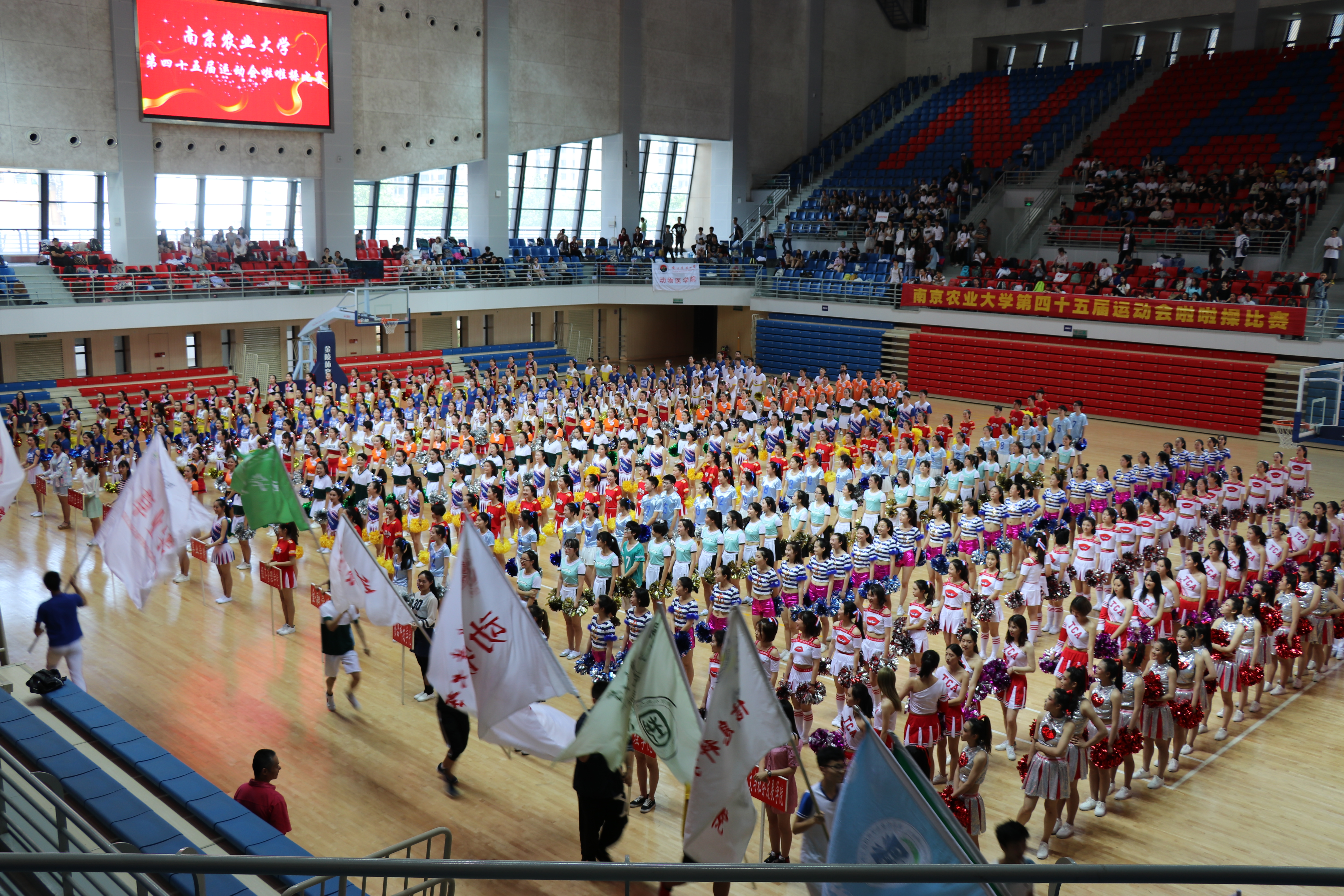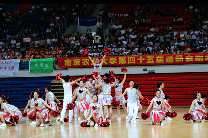 第四十五届运动会啦啦操比赛在卫岗校区体育馆隆重举行。本次比赛共有来自16个学院的16支代表队参赛,为保证比赛结果的公平性,评委则是由8名来自不同领域的老师组成。各个学院的辅导员以及同学们也纷纷到达现场为各自学院的啦啦操代表队加油助威。