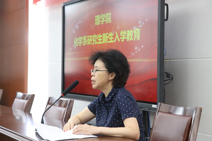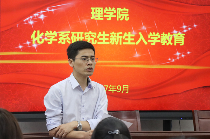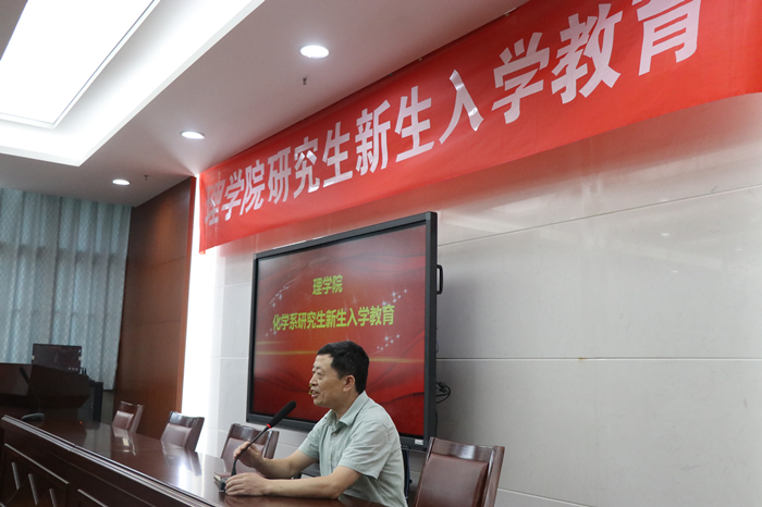 研究生新生入学教育在学院报告厅举行,出席此次活动的有院党委书记程正芳老师、院长章维华教授、院党委副书记刘照云老师、副院长吴磊教授、学科点长杨红教授和吴华教授,本次入学教育由化学系系主任朱映光教授主持。