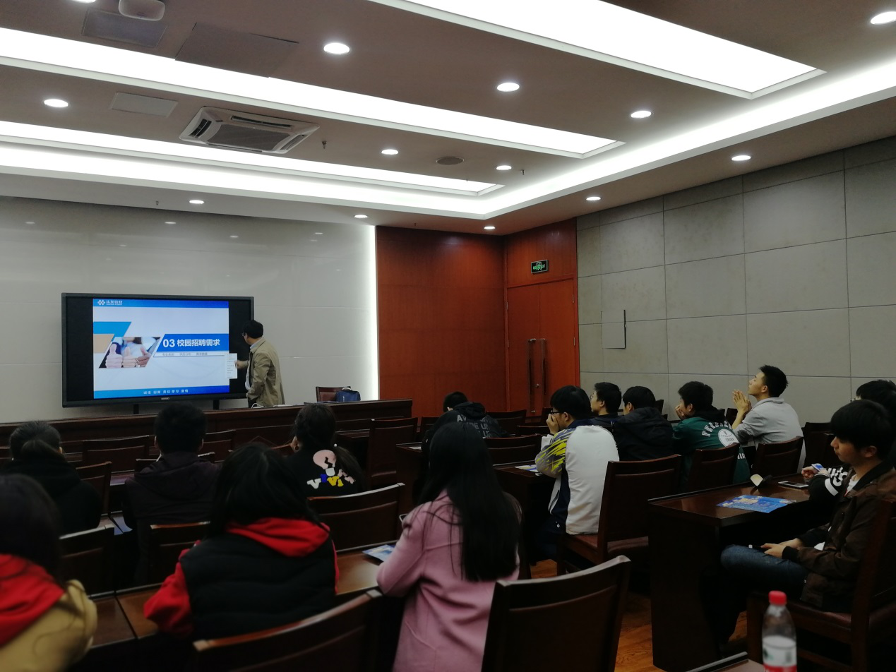 王世豪老师抓住毕业生们关注的核心关键,从公司发展、人才需求、福利待遇、硬件设施等方面就公司情况做了详细介绍,并播放了宣传片让同学们能更加了解企业文化,感受企业魅力。在介绍结束后,王老师还特意留了时间与同学们互动,耐心解答大家的困惑。