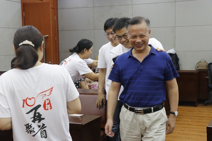 活动开始前,已有少许校友到达报告厅。不少已成家的校友也带来了自己的伴侣和小孩。熟悉的校友们相互讲述着自己近几年的经历或与当年的班主任陶亚奇老师交流,孩子们则在报告厅内嬉戏玩闹。之后在写有“阔别十年再聚首”的文化衫上相继留下自己名字。不久后刘照云书记与章维华院长相继而至,校友们见到昔日的师长不禁感叹岁月如刀,与当初校园中的青涩相比每个人的变化都相当之大。