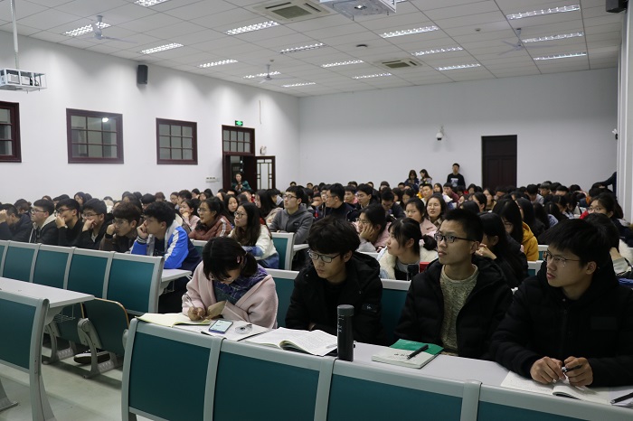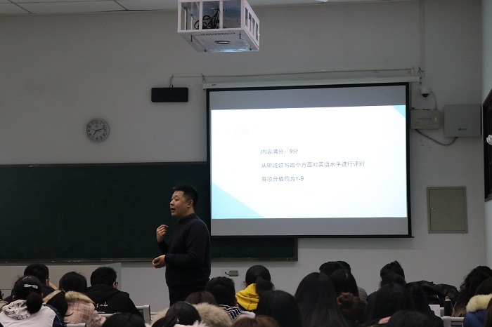 辅导员李歆老师首先进行了简要介绍,统计了意向学雅思、托福,以及出国的人数。之后培训机构的老师便对围绕雅思展开了细致的解读;他先介绍了雅思的考试时间,同时对当前雅思的前景作了分析,比如近年学习雅思人数的变化。他指出:一个人学习语言的最佳年龄——19至22岁,即正值大学期间。