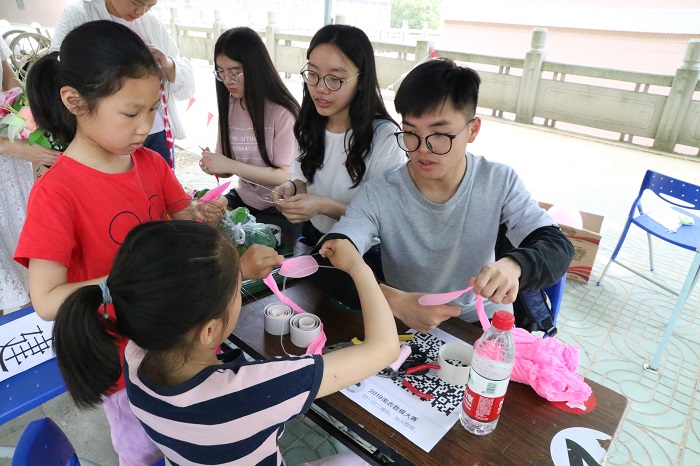 该活动吸引了不少的同学,同时还有几位阿姨与小朋友,他们积极参加做丝网花的活动,还有部分同学在自己叠好的爱心上用心写下了对母亲的祝福。