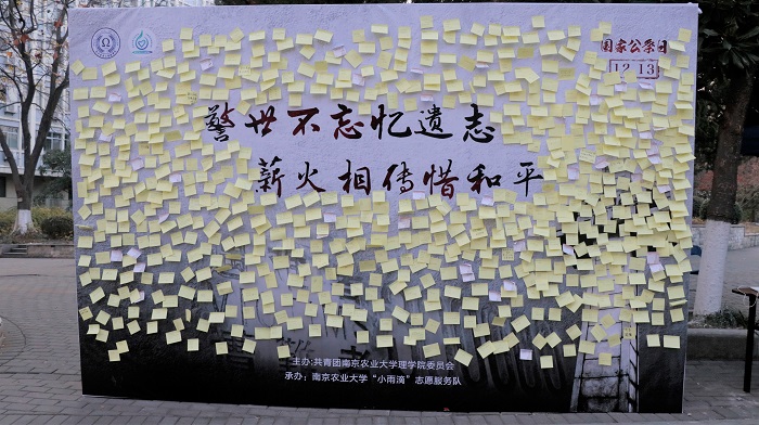 本次主题活动采用线上线下相结合的形式。线上以H5的形式带大家回顾历史,警示青年大学生要铭记使命,奋发图强。线下面向全校师生举行了“铭记国殇历史,听述英烈事迹”“回望沧桑岁月,竞答雨花峥嵘”“不忘革命初心,留言祈愿和平”“穿越时空的对话——烈士家书诵读”系列活动。通过校园快闪、现场讲解、互动答题、祈愿留言等形式,深切表达南农青年对国家公祭日的深思以及吾辈自强的决心。