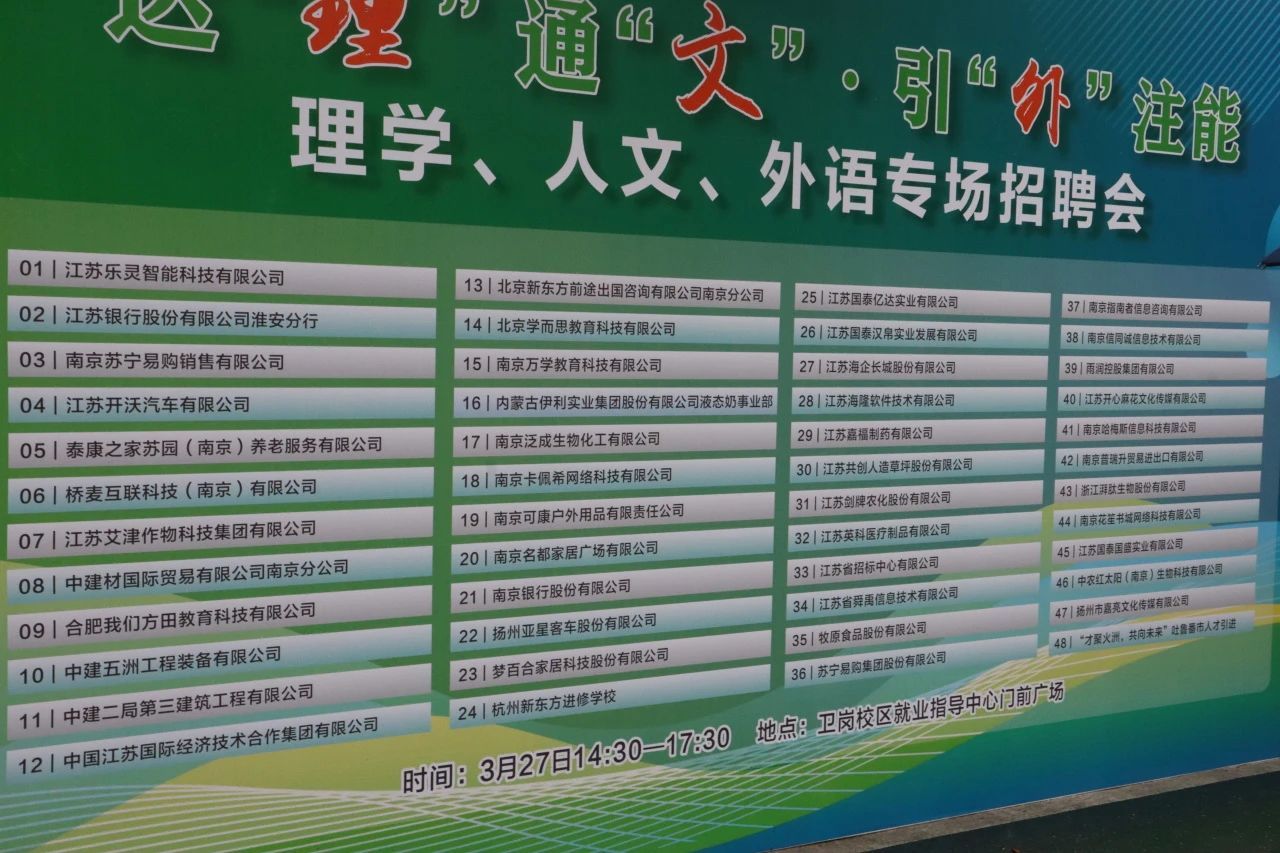 本场招聘会邀请了共49家企业,包括南京银行股份有限公司、苏宁易购集团股份有限公司、北京学而思教育科技有限公司、江苏剑牌农化股份有限公司等多家实力雄厚的知名企业,为即将步入社会的毕业生打开了广阔的职业发展之门。参会单位非常重视通过校园招聘广纳贤才,为企业人才队伍建设与高质量发展注入新生力量。