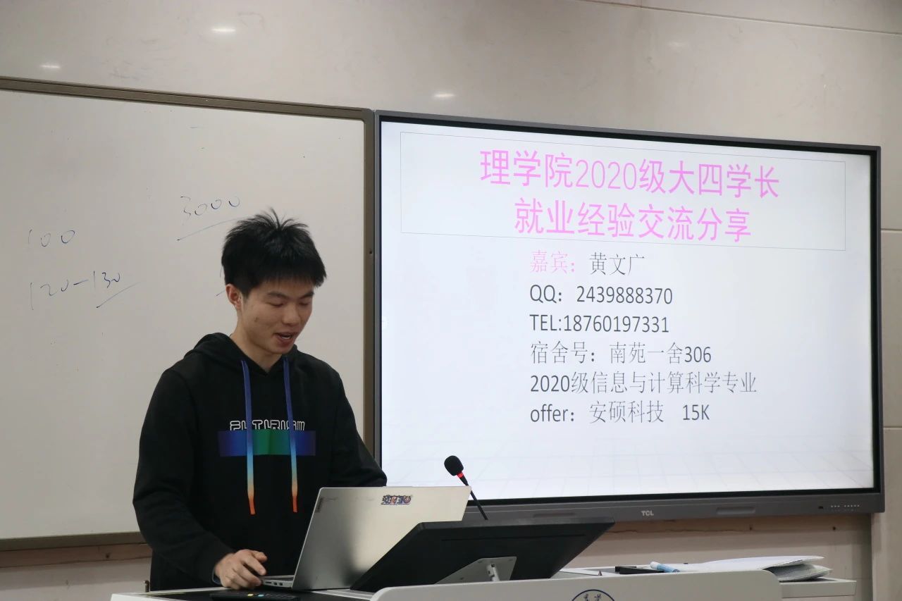 在会议的最后,2020级信科专业黄文广学长从自身和周围一些同学的经历入手,与同学们分享了他自身在面对就业问题和进行就业准备时的一些经验,并提出了许多宝贵建议,希望学弟学妹们能够不断夯实学科基础,学好专业技能,同时广泛了解就业方向以及相关前景,高瞻远瞩,提前做好就业规划,有条不紊地做好相应准备。最后,黄文广学长向在场大三学子致以诚挚祝愿,希望每位大三的学弟学妹都能成功上岸,实现个人目标。