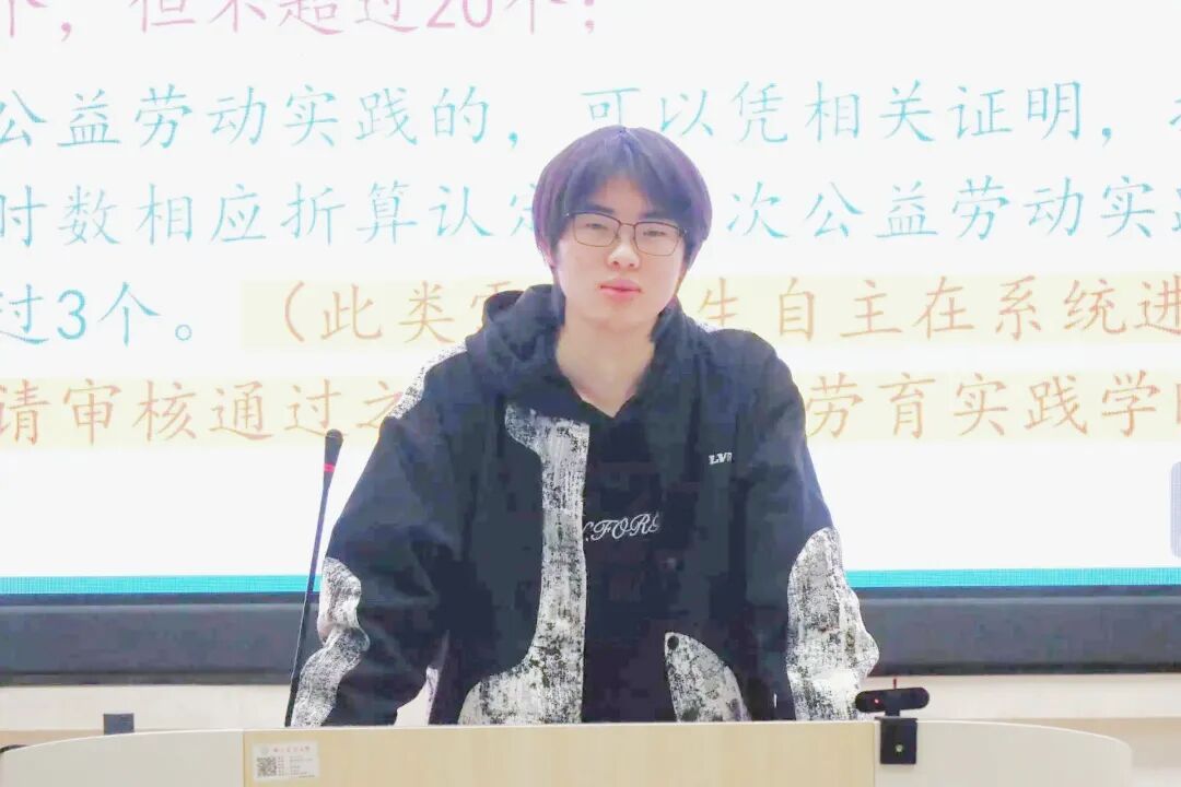 团委学生会组织部部长詹凯迪从二课堂学时要求、活动参与类学时认定、自主申请类学时认定等方面展开讲解,清晰阐明第二课堂与学业发展、综合素质评价的关联,指导新生第二课堂相关系统的登录及使用,帮助新生更有方向地规划大学生活。