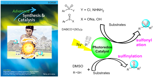 吴磊教授课题组在Top期刊Advanced Synthesis & Catalysis (Ranking in Applied Chemistry:2/72,SCI IF-2016: 5.646)在线发表题为“Photoredox Catalysis in C-S Bonds Construction: Recent Progress in Photo-Catalyzed Formation of Sulfones and Sulfoxides”的综述论文。该论文受到审稿人及期刊主编的高度评价并被遴选为VIP 文章(Very Important Publication)和封面(Front Cover Picture),论文第一作者为我院青年教师祝洁,通讯作者为吴磊教授,参与该工作的还有博士生杨文超和硕士生王晓东。
