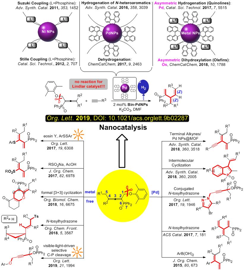 吴磊教授课题组在国际权威刊物Organic Letters(美国化学会-有机通讯,SCI-IF2018: 6.555, organic chemistry ranking: 2/57)在线发表了题为“Cascade Alkynylation and Highly Selective Hydrogenation Catalyzed by Binaphthyl-Palladium Nanoparticles Accessing Phosphinyl (Z)-[3]Dendralenes” 的研究论文。福利姬