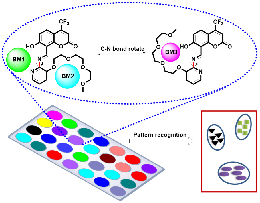检测环境和动植物体内金属离子的种类和含量对于避免重金属毒害、认知特定金属离子的生物学功能具有重要的意义。如何实现对多种金属离子的快速同步定量检测是该领域的一项难题。由于原子吸收光谱和电感耦合等离子体质谱等设备价格高、不具便携性、不能原位检测、且对样品有损等原因,发展基于模式识别原理的阵列传感器用于检测多种金属离子成为该领域的研究热点。然而,阵列传感器的工作原理要求设计数个具有交叉响应的传感单元,这个内在要求大大增加了其设计难度和制造成本。在本工作中,我们设计合成了一个基于激发态分子内质子转移和分子内电荷转移双重光物理传感机制的新型香豆素-吡啶荧光受体分子X1,该分子具有显著的溶剂导向荧光特性,并且可以巧妙地通过香豆素和吡啶骨架之间C-N键的旋转实现多种不同金属离子配位模式的转换。基于单一X1分子所构建的荧光阵列传感器X1SA能够实现对共20种碱金属、碱土金属和过渡金属离子的准确识别和快速定量检测,能够准确地鉴别血样中的亚铁离子、铁离子及其混合物,为研究铁元素载氧和通过芬顿反应产生活性氧等生物学功能的工作机制提供了技术支持。以上结果表明,通过合理的分子设计,构建基于单个有机小分子的低成本、高效能荧光阵列传感器用于复杂体系中多种金属离子的同步定量检测具有非常光明的发展前景。