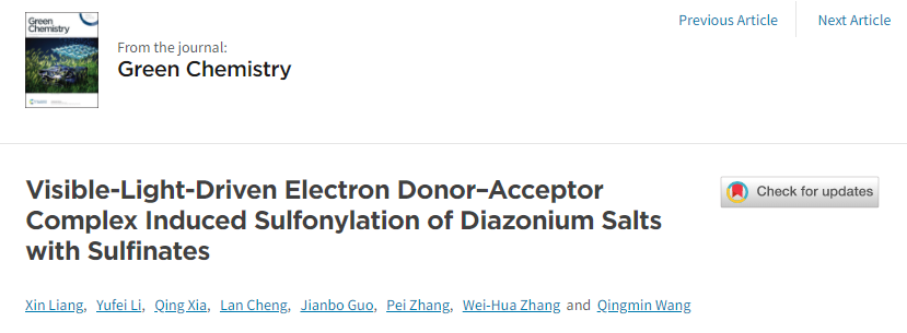 章维华、夏青团队完成的题为“Visible-Light-Driven Electron Donor–Acceptor Complex Induced Sulfonylation of Diazonium Salts with Sulfinates”的研究论文。该研究发展了可见光促进EDA复合物(electron donor–acceptor complex)引发的亚磺酸钠与芳基重氮盐的磺酰化反应,成功实现了芳基砜类化合物的绿色、经济、便捷的构建方法。