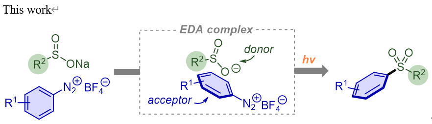 近些年来,光有机催化反应已成为有机合成中最具吸引力的研究领域。其中光促进电子给体受体复合物(EDA complex)引发的自由基反应因其无需光催化剂和过渡金属催化剂、温和的反应条件而受到越来越多的关注。基于该课题组已发展的EDA复合物促进的烷基化(Org. Lett.2020,22, 7290)和氰基化(Org. Lett.2020,22, 9638)反应,作者设想两种简单易得的原料——芳基(杂芳基)重氮盐和亚磺酸钠作为电子受体和电子给体,从而实现可见光促进的磺酰化反应。该反应的优势在于:1)未使用过渡金属催化剂、配体、光催化剂和氧化剂,反应条件温和,对环境友好,符合绿色化学的发展需求;2)反应底物简单易得,反应兼容性好,原子经济性高,成本低廉。