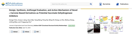 朱映光教授团队以天然产物L-香芹酮为骨架,设计并合成了三类全新的L-香芹酮基衍生物,系统评估其抗植物病原真菌活性,并深入探讨其作用机制。相关研究以“Design, Synthesis, Antifungal Evaluation, and Action Mechanism of Novel L‑Carvone-Based Derivatives as Potential Succinate Dehydrogenase Inhibitors”为题,发表于农业综合国际权威期刊《Journal of Agricultural and Food Chemistry》。