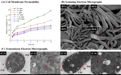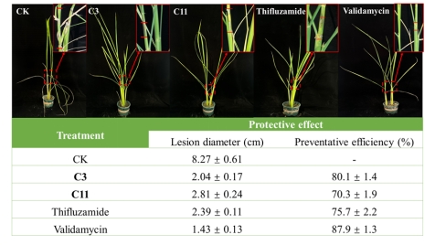 为进一步揭示其作用机制,研究团队开展了一系列机制验证实验。细胞膜通透性测试、扫描电镜(SEM)与透射电镜(TEM)观察表明,C3能显著破坏病原菌的细胞结构和减少线粒体数量,诱导细胞膜通透性升高,从而抑制菌丝生长。线粒体膜电位测定显示,C3处理可显著降低R. solani线粒体膜电位,提示其作用机制可能涉及诱导线粒体功能障碍,并通过体外SDH酶活实验验证了其靶标。