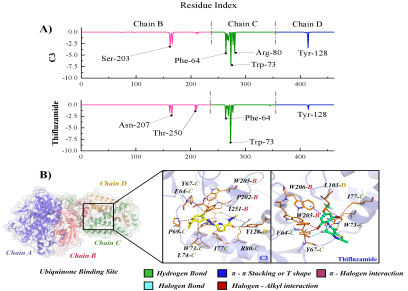 通过分子对接与分子动力学模拟进一步分析了活性小分子配体与靶标之间的动态稳定过程,揭示了三类化合物抗菌活性差异的根本原因。此外该研究还进一步深入分析化合物C3的稳定因素。结果显示,C3与靶标蛋白琥珀酸脱氢酶(SDH)结合稳定,结合能(−29.1 kcal/mol)与对照药物啶酰菌胺(−29.8 kcal/mol)接近。构象分析表明,C3的香芹酮骨架与SDH活性口袋内关键残基形成稳定的疏水和π-π堆积相互作用,且分子占据与啶酰菌胺相似的结合位点,验证了其作为SDHI类杀菌剂的潜力。