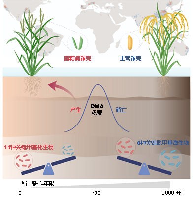 图1.稻田耕作年限通过影响砷甲基化与脱甲基化功能微生物间的平衡来影响二甲基砷(DMA)的“产生—消亡”,进而影响稻米中DMA的积累和水稻直穗病发病情况。