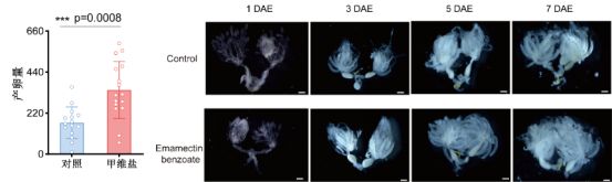 研究发现,经亚致死剂量农药处理后,褐飞虱雌虫的卵巢发育速度明显加快,体内成熟卵的数量大幅增加,最终单雌产卵量比没接触农药的对照组显著提高。这意味着,少量农药不仅没抑制害虫繁殖,反而成了它们的“繁殖加速器”(图1)。