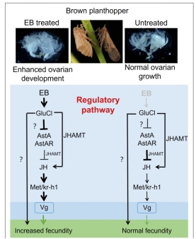 保幼激素是昆虫体内调控生长发育和繁殖的重要激素,对雌虫卵巢发育、卵的成熟至关重要。实验发现,接触亚致死剂量农药后,褐飞虱雌虫体内的保幼激素含量明显升高。同时,与保幼激素合成相关的基因JHAMT,以及传递保幼激素信号的基因Kr-h1,其活性也显著增强。