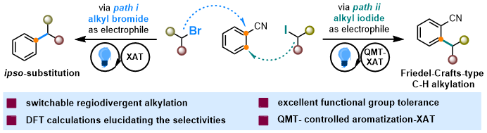 该研究在相同的光催化反应体系中,将烷基溴化物更换为烷基碘化物,即可像“开关”一样,轻松地将反应路径从“氰基位点取代”切换至“碳氢位点烷基化”,从而高选择性地获得两种结构迥异的烷基化产物。这种底物控制的模式,为合成化学家提供了新颖的反应灵活性和精准度。