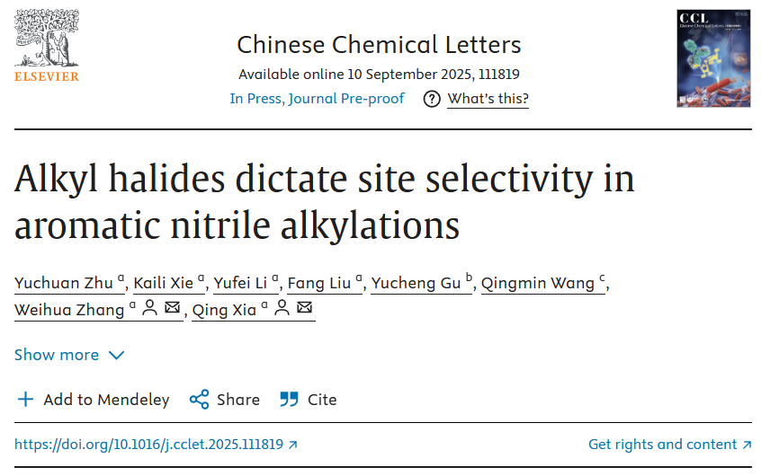 章维华和夏青团队开发了一种通过简单更换烷基卤化物即可精准调控芳基腈烷基化反应区域选择性的新策略。近期,该研究工作以“Alkyl halides dictate site selectivity in aromatic nitrile alkylations”为题,发表在国际知名期刊《Chinese Chemical Letters》。