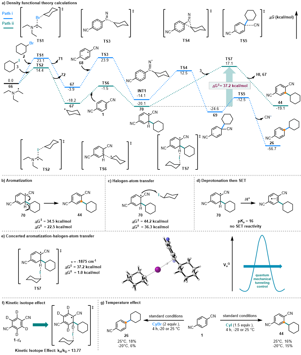 结合机理探究实验,理论计算进一步揭示了两种路径分岔的根源。ipso-取代路径(path i)经由自由基加成-氰基离去过程。C–H烷基化路径(path ii)则涉及量子力学隧穿效应(Quantum Mechanical Tunneling, QMT)促进的芳构化-卤素原子转移过程,该机制在低温下仍保持高效,进一步验证了隧穿主导的氢转移过程。