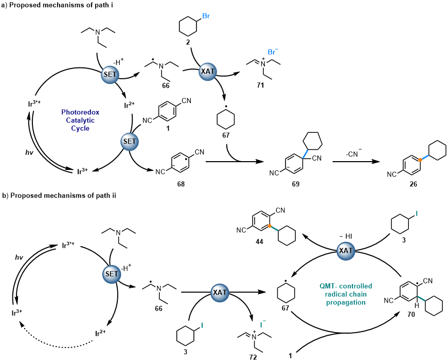 通过自由基捕获实验、自由基钟实验、荧光猝灭实验、链式反应等验证实验证实了反应为自由基路径,并初步证明烷基溴化物与烷基碘化物分别导向ipso-取代和Friedel-Crafts型C–H烷基化机理。