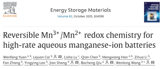 邱博诚教授团队在材料领域国际知名期刊《Energy Storage Materials》上发表题为“Reversible Mn3+/Mn2+redox chemistry for high-rate aqueous manganese-ion batteries”的研究论文。该研究基于可逆Mn³⁺/Mn²⁺氧化还原化学实现高倍率水系锰离子电池,为锰离子电池在电网级储能领域的应用提供了新思路。