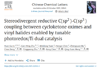 朱映光和陈康团队与邓超课题组,以及中科院化学研究所孟庆元研究员团队合作, 发展了可调控的光氧化还原/钛协同催化策略,成功实现了环酮肟与烯基卤化物的立体发散性还原C(sp2)-C(sp3)偶联反应。该研究工作以“Stereodivergent reductive C(sp2)-C(sp3) coupling between cycloketoneoximes and vinyl halides enabled by tunable photoredox/Ti dual catalysis”为题发表于化学领域国际知名期刊《Chinese Chemical Letters》上。