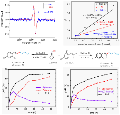 自由基捕获实验,荧光淬灭实验等机理实验可以证实反应经历了自由基路径;EPR实验结果证实反应过程中有Ti(III)物种生成;而通过对反应体系中产物构型的监测表明,最初生成的热力学稳定的烯烃会被光催化剂激发为三线态,从而发生构型的翻转获得热力学不稳定的异构体。